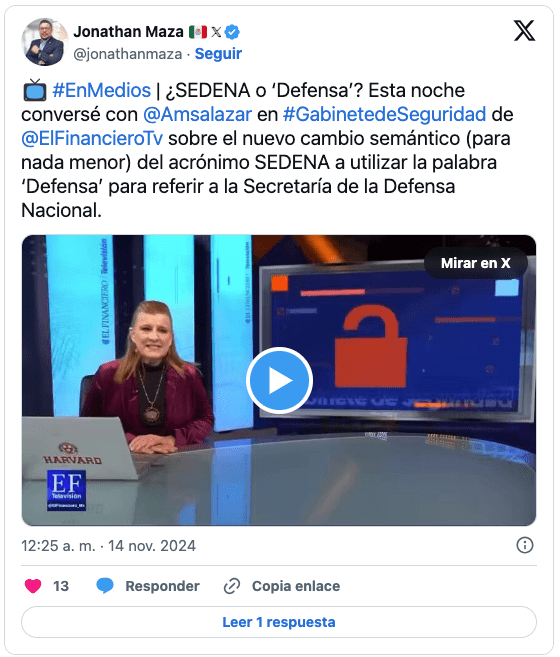📺 #EnMedios | ¿SEDENA o ‘Defensa’? Entrevista de Jonathan Maza para El Financiero, en el programa Gabinete de Seguridad con Ana María Salazar, sobre el nuevo cambio semántico (para nada menor) del acrónimo SEDENA a utilizar la palabra ‘Defensa’ para referir a la Secretaría de la Defensa Nacional.